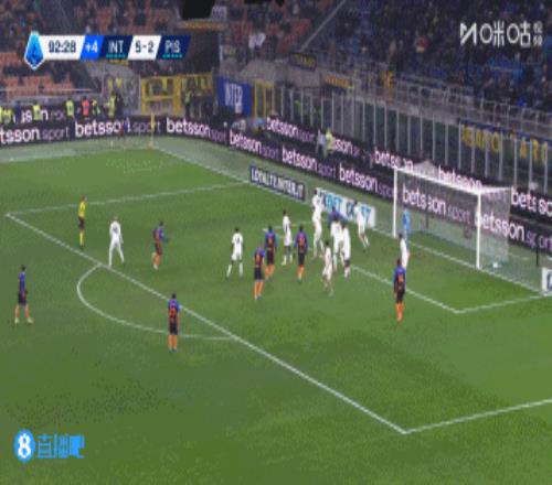 全场比赛补时阶段,国米的左侧角球机会开入禁区,比塞克头球摆渡,姆希塔良门前头球接力再入一球,国米6-2比萨完成了让二追六的好戏!