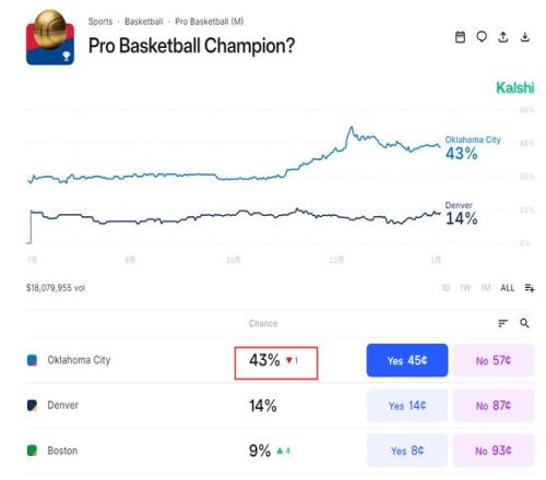 雷霆队的夺冠概率再度下滑1%,目前是43%,虽然也是断崖第一,但随着他们之后继续吞下失利,他们的夺冠概率会持续下滑,本赛季的雷霆输掉太多不该输的球。