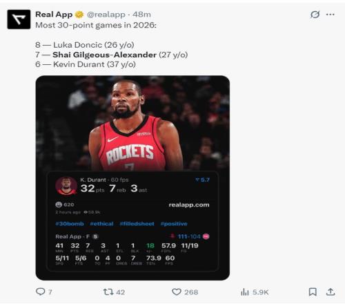 3.2026年SGA拿到7次30+仅次于东契奇;